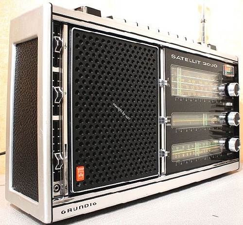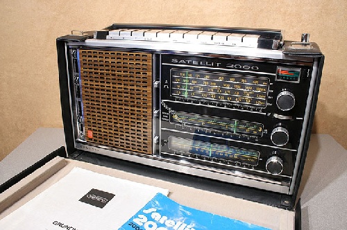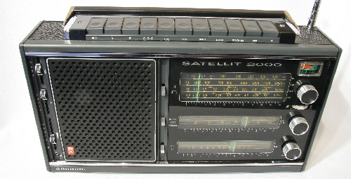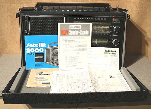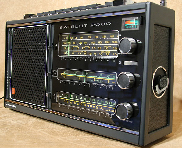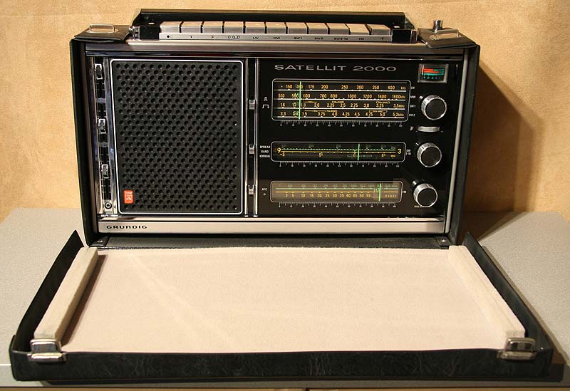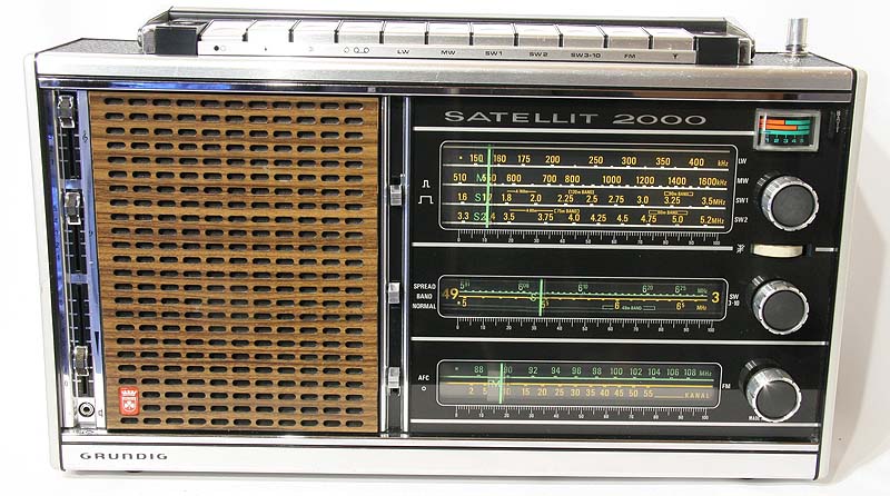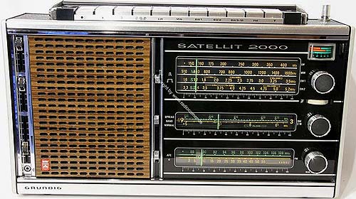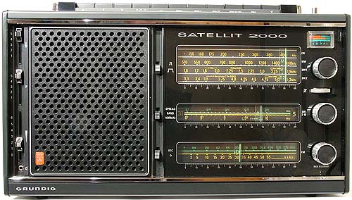 Grundig Satellit 2000 This particular model was built for 2 years between 1973 and 1975. As slide adjustments were still the rage they were also featured on the Grundig Satellit 2000. Mechanically this model saw many changes including taking the drum tuner and placing it horizontally which allowed for easier reading of the frequencies. Naturally Grundig infused it's superior technical know-how into this beautiful worldreceiver and it's performance continued to impress with great reception and that fabled Grundig Sound. Grundig Satellit 2000Der Grundig Satellit 2000 wurde von 1973 - 1975 gebaut und Grundig rüstete auch diesen Weltempfänger mit Schiebereglern aus. Mechanisch wurde dies Radio vollkommem verändert gegenüber den Vorgängermodellen. Der Trommeltuner wurde erstmalig horizontal angeordnet. Er ließ sich so besser ablesen. Natürlich wurde der Grundig Satellit 2000 auch auf den technisch neuesten Stand gebracht und glänzte mit ausgezeichneten Werten.